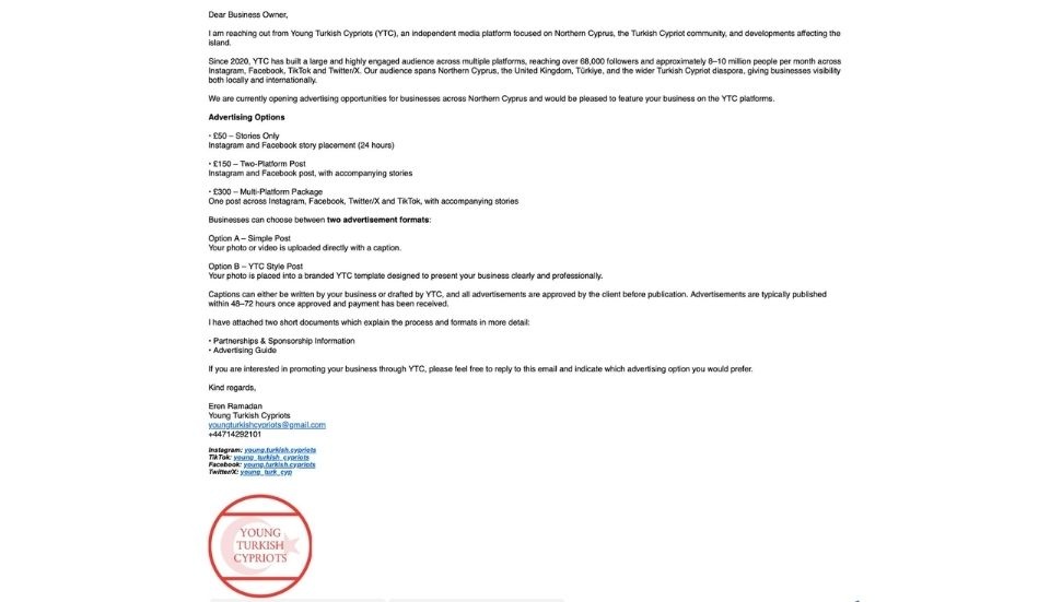 Kuzey Kıbrıs’ta faaliyet gösteren işletmelere gönderilen tanıtım yazılarında, “Young Turkish Cypriots (YTC)” adlı oluşumun sosyal medya platformları üzerinden reklam ve tanıtım hizmeti sunmak için ücret talep ettiği görülüyor.